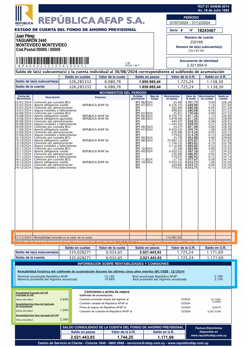 Aquellas personas que tienen ahorros en una AFAP reciben su estado de cuenta en formato físico y/o por correo electrónico. Allí se encuentra el detalle de los movimientos del período; ingresos y egresos a la cuenta en caso de haber, información sobre rentabilidades y comisiones, y el saldo consolidado de la cuenta del Fondo de Ahorro Previsional.